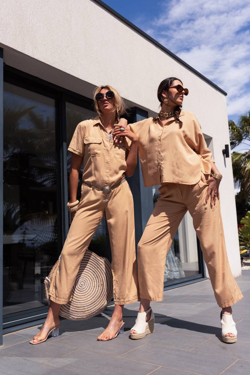 Cette combinaison pantalon en Tencel incarne l’élégance naturelle et la modernité de la femme de Jérusalem. Sa coupe fluide et légèrement cintrée souligne la silhouette tout en offrant un confort absolu grâce à la douceur du tissu. Le col chemise, les poches plaquées et la ceinture fine apportent une touche à la fois urbaine et féminine, idéale pour une allure chic sans effort. Confectionnée dans une matière respirante et soyeuse, cette pièce se porte aussi bien en journée qu’en soirée, dans les rues ensoleillées de Jérusalem. Disponible en plusieurs teintes raffinées — Ocre pour un éclat chaud et lumineux, Framboise pour une touche audacieuse et vibrante, Olive pour une élégance naturelle, et Beige pour un style doux et intemporel — cette combinaison s’adapte à toutes les envies. Son esprit bohème chic s’accorde parfaitement à la mode libre et inspirée de Jérusalem. Et pour un total look harmonieux, elle peut se coordonner avec le paréo en voile de coton, décliné dans les mêmes coloris, pour un ensemble féminin et raffiné.