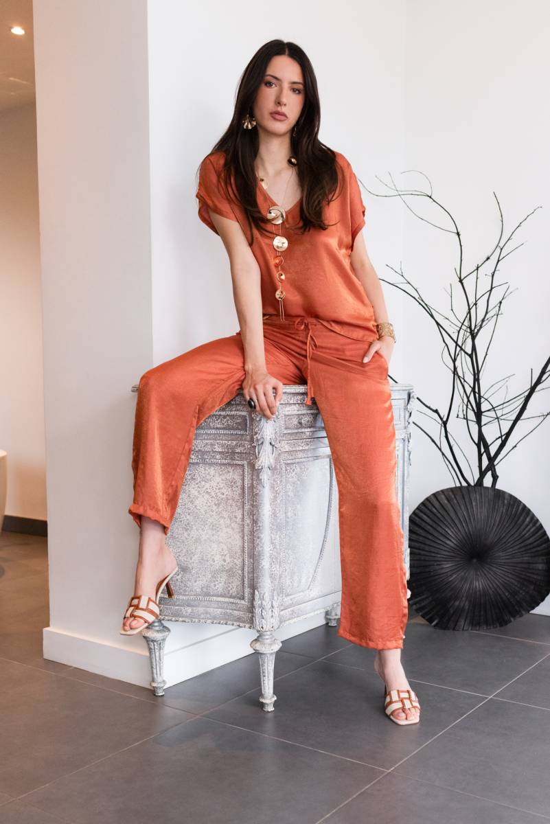 À Annecy, cet ensemble est exactement le genre de look qu’on enfile sans réfléchir et qui fait tout de suite son effet. Le tee-shirt col V apporte une touche féminine et flatteuse, avec une coupe fluide qui tombe parfaitement. Il est facile à porter au quotidien, mais assez chic pour passer direct d’une journée en ville à un apéro au bord du lac.
